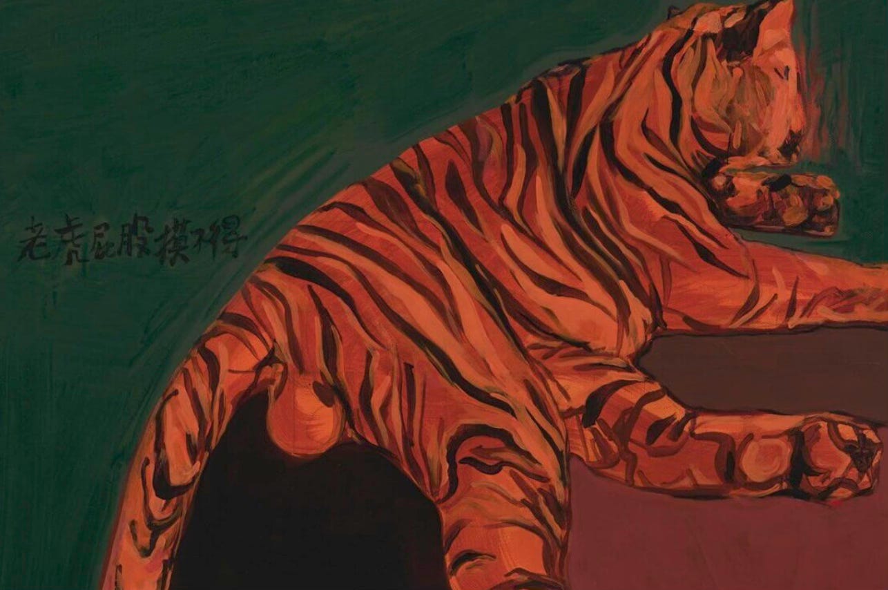 The White Rabbit show brings together works by 28 artists who have been prepared to take their chances and buck the system. Not all of them live in China, and many take an oblique approach, such Yu Ji, whose small painting at the entrance of the show depicts a red tiger lazing on the ground. The title is translated as The Tiger’s Butt Cannot be Touched (2023). Its near neighbour is a sculpture by Tian Longyu of a life-size elephant covered in tiger stripes, with a tiger’s face implanted on its backside. Both works are variations on the old adage about the dangers of catching a tiger by the tail.