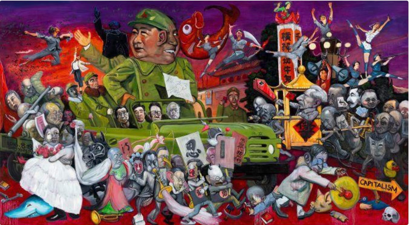 A large painting by Meng Site, also represented in the ACAR Art Prize, called Future Land of Happiness (2023), is a surreal satire that transforms a street into a circus. The symbolism is insistent, but perfectly ambiguous.
