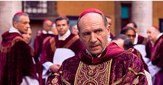 We begin with Lawrence being summoned to the chambers of the old Pope, who is already dead. A liberal and a reformer, the Pope has left a legacy that remains sacred to his closest associates. As the story progresses, the late Pope will continue to exert a powerful influence on proceedings as his acolytes discover he distrusted everybody and took an active interest in who would be his successor. The dead Pope is never named, but he bears a suspicious resemblance to the current Pope Francis.