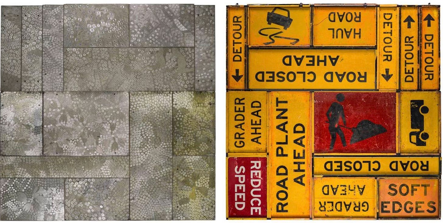 As is so often the case with these big competitions the artist who seemed most unlucky to have missed out last year, emerged on top this time around. In the 2024 NATSIAA, Gaypalani Wanambi’s engraved metal work, River of Honey, currently on display in the Yolngu Power exhibition at the Art Gallery of NSW, was arguably the stand-out. This time, Gaypalani was the winner, with an even larger work, Burwu, blossom, a 3 by 3 metre composite panel suspended from the ceiling. Comprised of discarded road signs left intact on the verso to form a kind of Pop collage, the front of the work is polished steel, covered in delicate engravings of blossoms.