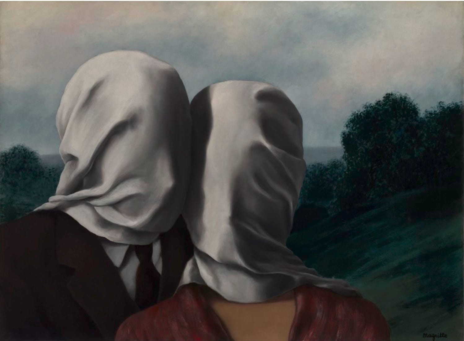 In The Lovers (1928), from the collection of the National Gallery of Australia, we see a man and a woman with their heads covered in shrouds. The title prompts us to think of “blind love”, or perhaps love and death. Magritte would ask the questions and leave his audience to come up with their own answers. He was adamant that his motifs should not be seen as “symbolic” or subjected to psychoanalytical interpretations. He painted concrete forms, drawn from everyday life, popular magazines or the encyclopaedia. “There is only one mystery,” he told a prying interviewer, “the world.”