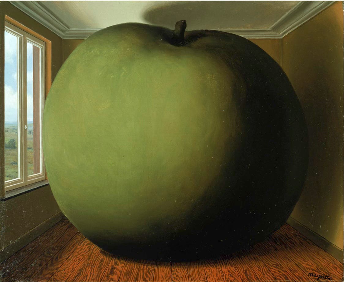 Happily, Magritte made numerous variations on his favourite motifs. The apple in the room is famous, but he filled another room with a rose and yet another with a stone. There are multiple pictures featuring a painted landscape on an easel in front of a window, through which we see the real landscape; or a broken window that retains the image of the outside world.