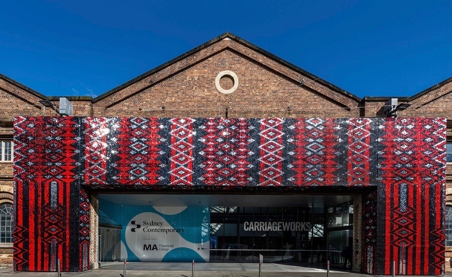 With hundreds of others, I stood at the entrance of the Sydney Contemporary Art Fair last Wednesday, at the conclusion of the VIP preview, watching the rain pour down in torrents. Were the angry Gods passing judgement on this year’s offerings? We can go a long time without rain in Sydney, but when it arrives, it comes down like a tsunami.